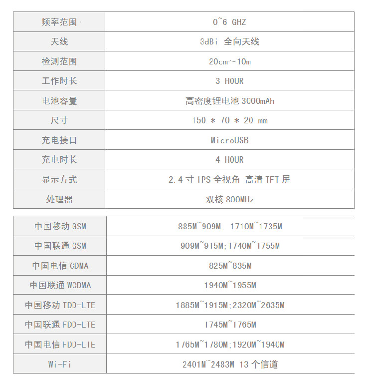 • H6 無線環境分析報警系統針對國內的三大運營商的無線通訊制式與協議以及其他工頻、通信協議進行全面優化,實現高精度、高準確度的無線信號設備的定位與防范。